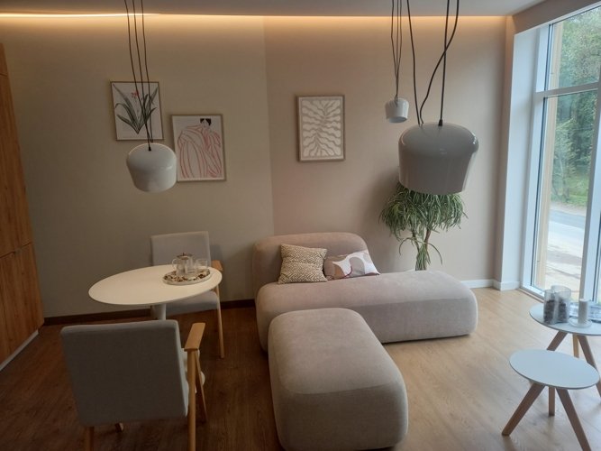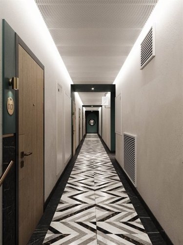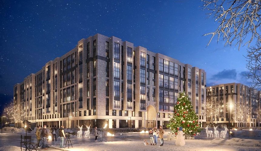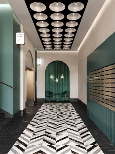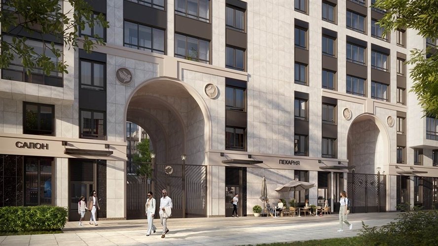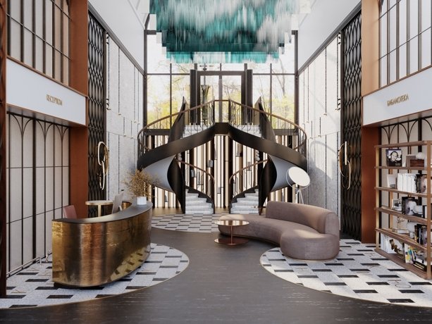 Дизайнерское лобби со вторым светом и высотой потолка до 9 метров расположится в корпусе третьей очереди, который будет построен напротив парка «Новознаменка». Площадь помещения составит 72 кв. м, в его оформлении отражена тема кинематографа. В форме двойной симметричной винтовой лестницы читается образ киноленты. Арки в настенных витражах возрождают в памяти образы вокзалов из кинокартин и перекликаются с архитектурным обликом комплекса. Украшением пространства станет динамическая инсталляция, парящая в воздухе под потолком. Различные сценарии изображений, транслируемые на прозрачные экраны, будут задавать соответствующее настроение и менять восприятие помещения. В помещении будут расположены стойка ресепшн и зона для отдыха, а сам интерьер и необычная лестница станут красивой декорацией для эффектных снимков и видео.