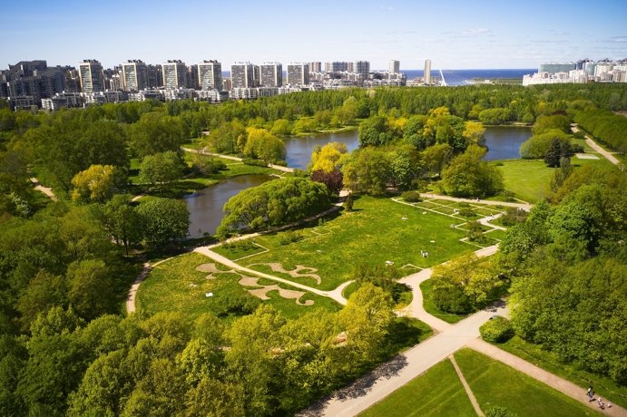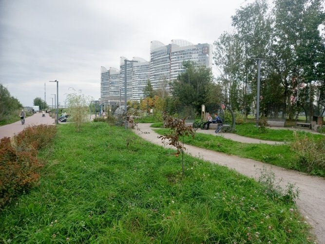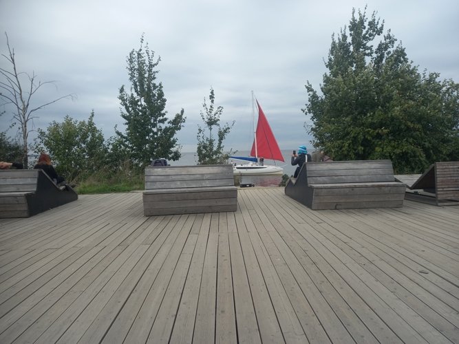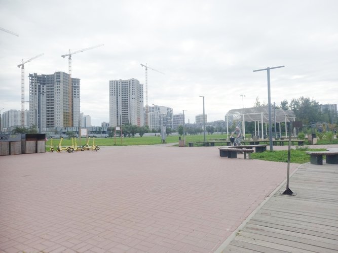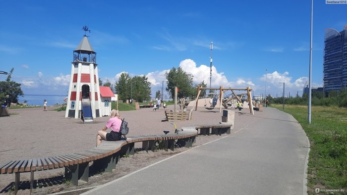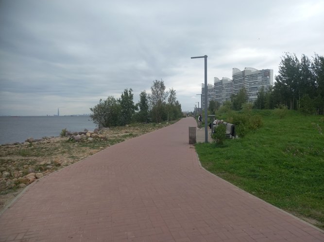 Это и прекрасное место для прогулки, и скамьи, и лежаки, и качели, и детские площадки, и спортплощадка. Другой такой оборудованной набережной вдоль Залива в Питере нет. Попасть туда - просто перейти Балтийский бульвар.